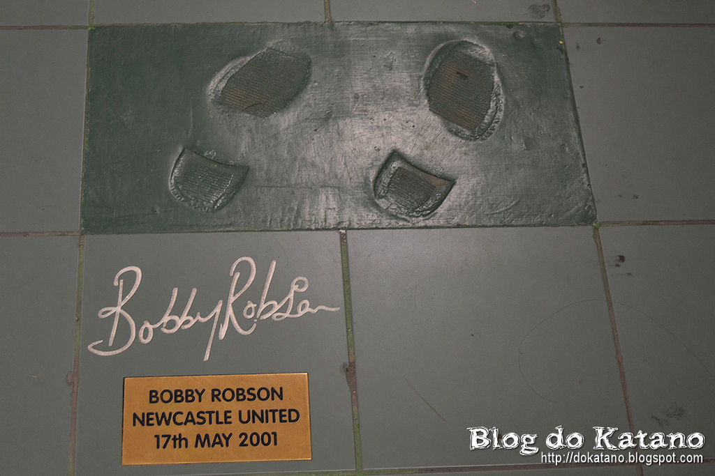 As pegadas de Bobby Robson imortalizadas na estação de metro de St James Park, ao lado de outras pertencentes a outras figuras que passaram pelo clube local como Alan Shearer.