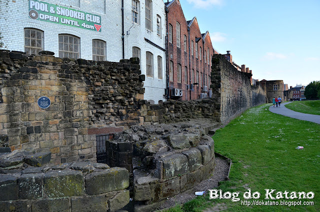 Praticamente no extremo Oeste da Westgate Road é possível encontrar o que resta das muralhas medievais (séculos XIII e XIV) que envolviam a Newcastle e que foram muito úteis para manter os irrequietos escoceses em respeito em vários momentos da História. Marcam o limite entre uma zona de bares em edifícios de aspecto industrial e uma zona verde. Reparem no lixo que se avista na relva. Se por um lado se encontram copos e embalagens um pouco por todo o lado, já cocó canino é coisa que não se vê em lado nenhum. É que, para um britânico, deitar lixo para o chão ainda vá, agora deixar cocó de cão é pura falta de civismo!