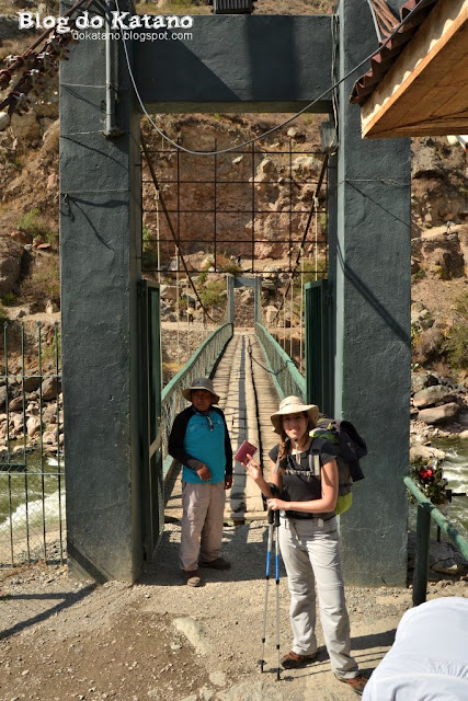 Assim que saímos do autocarro, enfrentámos pela primeira vez os vorazes mosquitos, que nos iriam perseguir ao longo da caminhada, o que nos obrigou logo ali a fazer uso do repelente (o nosso melhor amigo ao longo dos 4 dias!). Após os últimos preparativos, assim como um belo pequeno almoço servido ali à vista do rio Urubamba, dirigimos-nos finalmente ao checkpoint onde tivemos de mostrar os bilhetes e os passaportes. Uma formalidade que não se aplica aos residentes locais que habitam em pequenas comunidades ao longo do trilho. Com o passaporte carimbado, franqueámos o portal da ponte sobre o Urubamba. A caminhada tinha começado!
