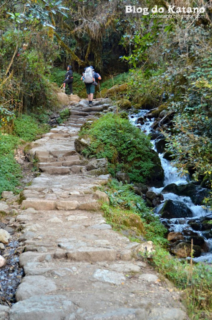Depois de uns minutos de pausa para hidratar, retomámos a caminhada para enfrentar a primeira subida digna desse nome. Nesta altura já tínhamos assimilado a rotina a seguir aquando da ultrapassagem por carregadores (a quem deve ser sempre facilitada a passagem). À aproximação de carregadores, o último do grupo gritava "Porter!" e ia-se passando a palavra, encostando ao mesmo tempo, sempre para o lado da montanha, para o deixar passar.