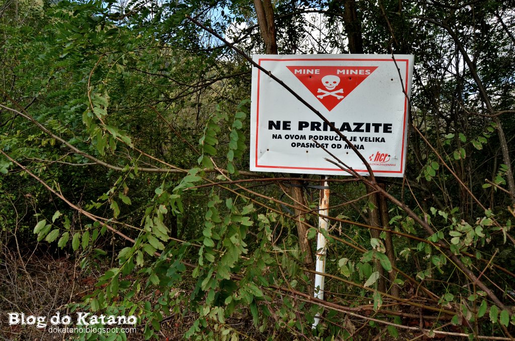 Finalmente a confirmação de que não era mesmo boa ideia caminhar em zonas pouco pisadas: um aviso de campo minado, uma das terríveis e persistentes heranças da guerra (ver aqui). Esta zona fortemente minada, usada como campo de treino para cães farejadores de explosivos, oferece um real risco de vida. Há alguns anos atrás, um oficial bósnio que por aqui procurava cogumelos, morreu após pisar uma destas minas.