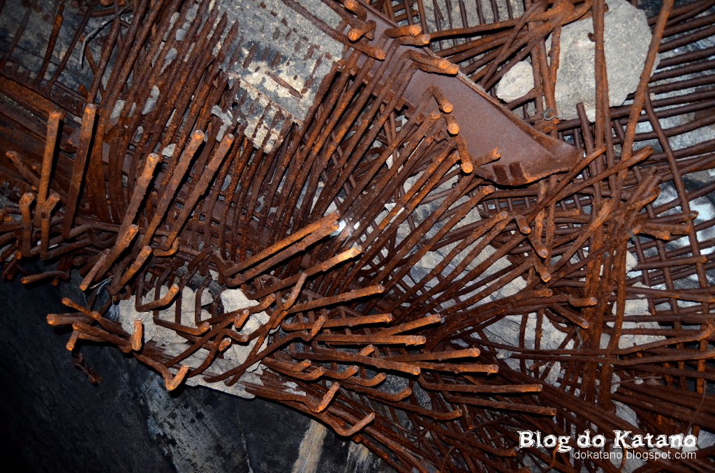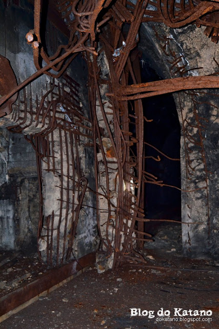 Apesar da lanterna, à qual juntámos a luz dos telemóveis, era difícil perscrutar aquela escuridão. Passada a primeira porta blindada ou, melhor dizendo, o que resta dela, o ambiente é assombroso. Sem ver nada para além de 20m à nossa frente, os únicos sons que se ouviam em todo aquele negrume eram os nossos passos e o esporádico gotejar da água em parte incerta. Tudo isto reverberava nos túneis contribuindo para um cenário inquietante.
