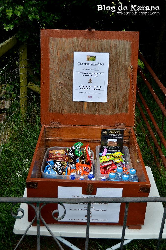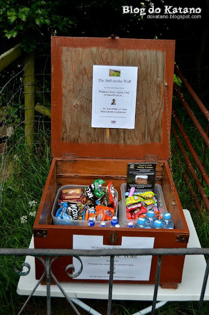 No final desta passagem pela Muralha, ao chegarmos ao sítio conhecido como Stall-in-the-Wall, fomos confrontados pela primeira vez com o conceito de "honesty box", literalmente a caixa de honestidade. Trata-se basicamente de uma caixa cheia de barras de cereais, chocolates, sumos e águas, mantida por um habitante local anónimo, da qual podemos tirar o que quisermos, deixando dentro de um pequeno tupperware o pagamento correspondente, de acordo com o preçário ali afixado. No dia seguinte teríamos o prazer de encontrar uma extrapolação radical deste conceito, num momento que proporcionou (mais) um encontro agradável. Mas disso falarei no próximo artigo.