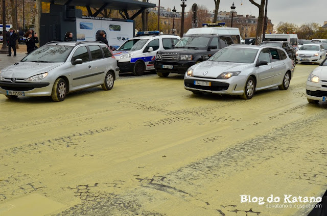 Foi com esse pensamento em mente que, a meio da manhã de Sexta-feira, emergimos da estação de metropolitano diante do Arco do Triunfo... para nos depararmos com um cenário de absoluto caos. Vários activistas da organização ecologista Greenpeace tinham decidido levar a cabo uma manifestação audaciosa: desenhar um gigantesco Sol na rotunda do Arco do Triunfo, apelando à utilização de fontes de energia renováveis.