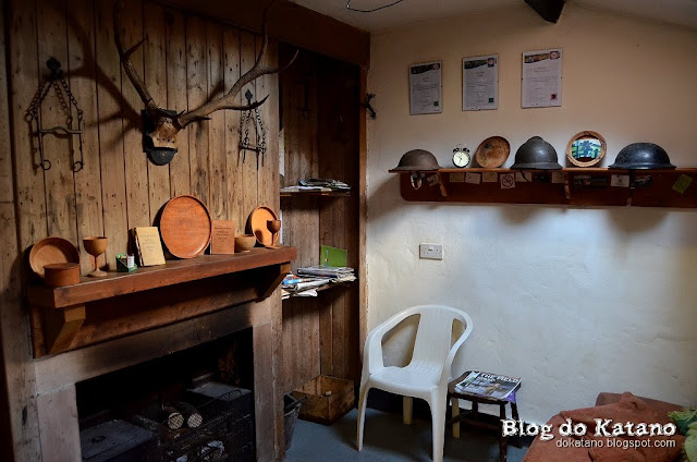 A sala de estar do barracão das camaratas, decorada com uma colecção de objectos da 2ª Guerra Mundial. Sobre a lareira encontravam-se duas publicações que tive a ocasião de folhear.