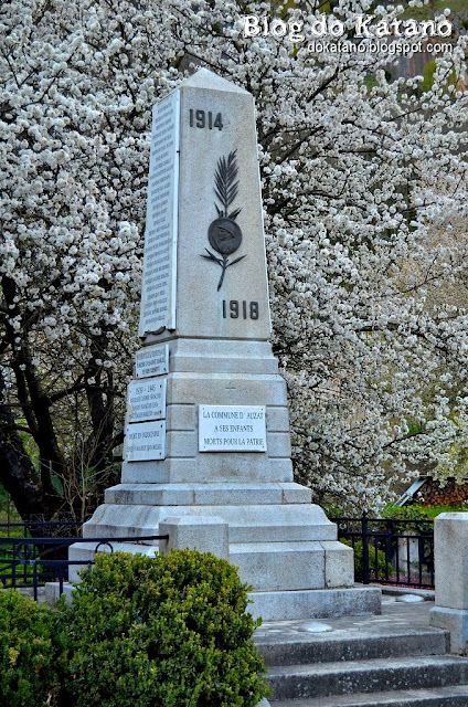 Monumento aos "filhos de Auzat" mortos pela Pátria, vestido de gala por uma cerejeira brava.