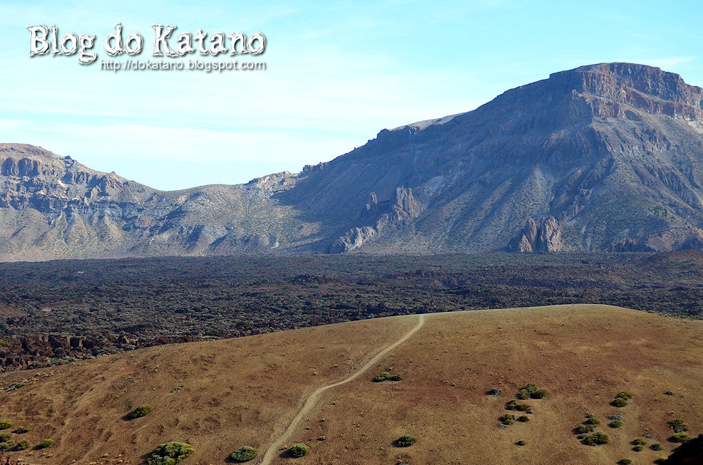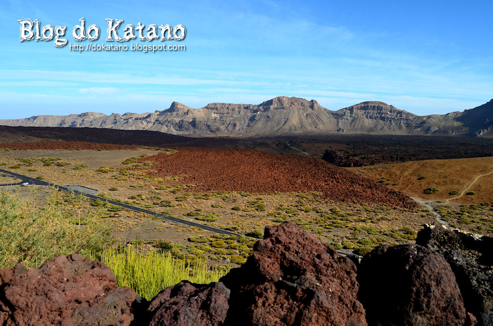 No outro lado do pequeno vale dá para imaginar a lava de elevada viscosidade que deu origem à elevação que se avista. Ao longe vislumbra-se o Observatório Astronómico do Teide.