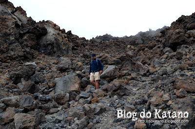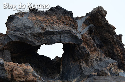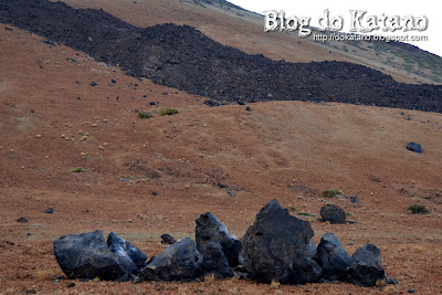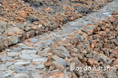 Já agora, convém também esclarecer que existem dois tipos de corrimentos de lava. O primeiro é o tipo "A a", que é a que mais por aqui se encontra, e que se caracteriza pela sua solidificação irregular e cortante, em forma de escória, devido à rápida perda de gases. O outro tipo é o tipo dito... (deixem-me consultar a cábula num instante)... "Pahoehoe", que forma uma superfície lisa ao solidificar.