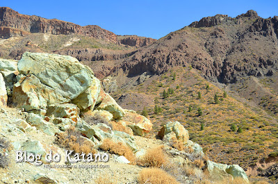 Outra das zonas mais interessantes (entre tantas) do espaço da grande cratera é a zona conhecida como Los Azulejos onde uma série de alterações hidrotermais conferiu um colorido muito característico às rochas, que vai do verde ao azul, passando pelo amarelo. A ilita e a caleonita são os minerais responsáveis pelas cores mais claras da "palete". Sinceramente, não faço ideia do que sejam estes minerais e estou apenas a reproduzir a informação constante do painel informativo no local só para impressionar.