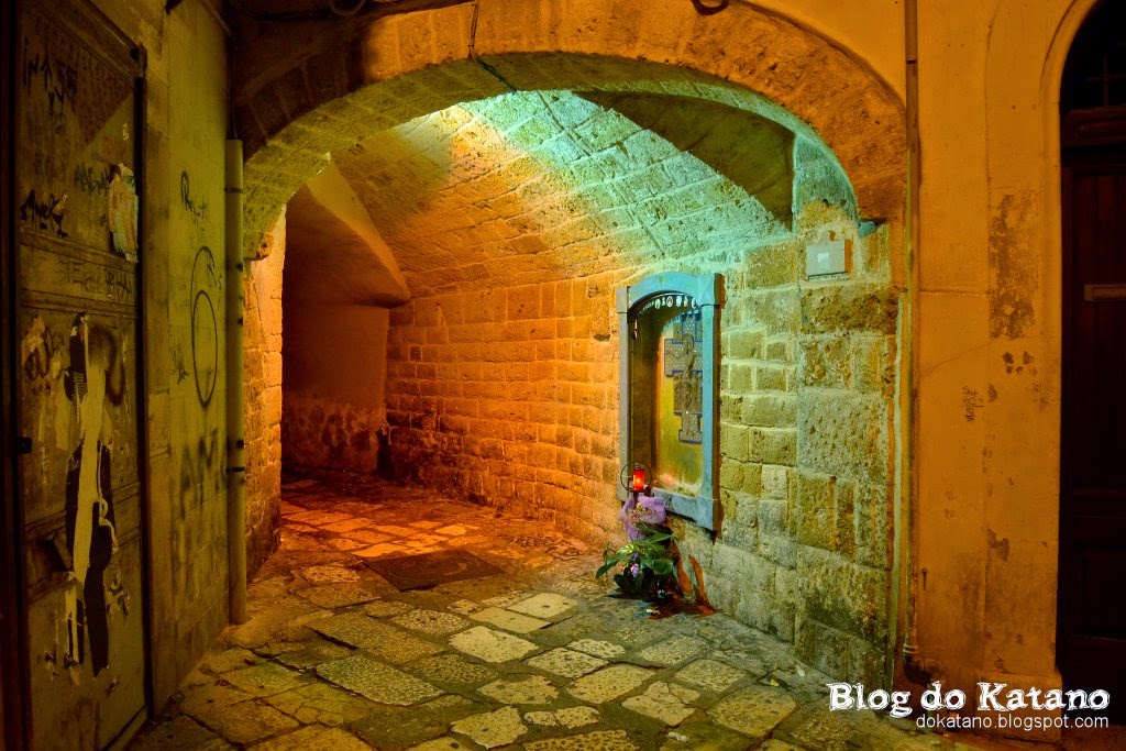Já em Bari (com um atraso de uma hora) uma caminhada de alguns minutos levou-nos até ao centro histórico onde se situava o B&B no qual iríamos passar a noite. O quarto situava-se no R/C da casa, com acesso directo para a rua, sendo muito bem cuidado e tendo uma porta interior "normal" e uma porta exterior espessa em aço reforçado, com fechadura de segurança, que nos deixou algures entre o seguro e o claustrofóbico.