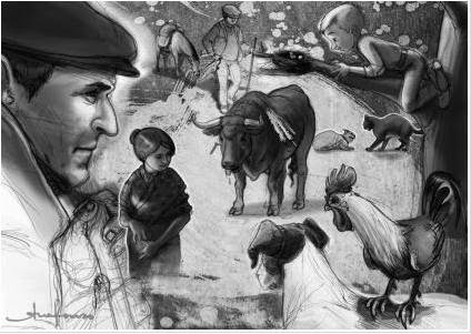 A multidão calou-se. Começou a ouvir-se, sedante, nostálgico, o som grosso e pacífico das chocas. A planície!... O descampado infinito, loiro de sol e trigo... O ilimitado redil das noites luarentas, com bocas mudas, limpas, a ruminar o tempo... A fornalha escaldante, sedenta, desesperante, que o estrídulo das cegarregas levava ao rubro. Novamente o silêncio. Depois, ao lado, passos incertos de quem entra vencido e humilhado no primeiro buraco... Refrescou as ventas com a língua húmida e tentou regressar ao paraíso perdido.