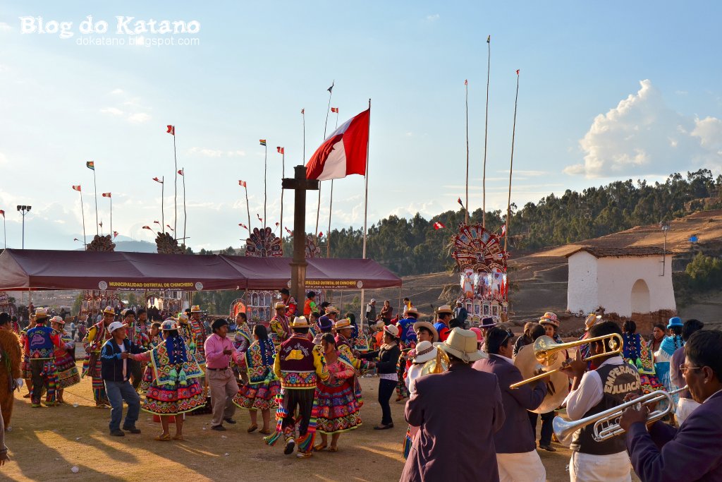 Aí o colorido das bandeiras, a música, as diversões e locais de venda de alimentos (a Ana ainda provou a maçaroca de milho branco cozido) e bebidas criavam um ambiente extremamente cativante. Por todo o lado se viam os trajes tradicionais de Chinchero, onde se destacam o preto e o vermelho. Percebemos também que os trajes são aqui considerados verdadeiramente como trajes de festa e não apenas para vestir como relíquias em grupos de folclore. Ao longe, um grupo sentado ao longo de um muro partilhava uma grande garrafa de cerveja, bebendo em sequência do gargalo. Um ritual habitual, segundo o nosso guia.
