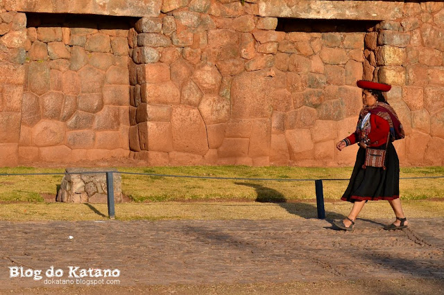 Uma habitante local passeando orgulhosamente o seu traje de Chinchero, diante de um muro Inca com indícios de restauro.
