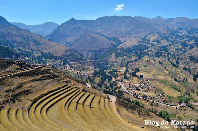 Pisac, com as suas diferentes zonas. Os socalcos dominam a paisagem enquanto as áreas edificadas se situam nos dois extremos da fotografia. Acima das construções da esquerda, sobre a pequena elevação que aí se vê, situava-se o Intihuatana, o Templo do Sol.