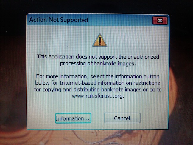 Armado em esperto, decidi ir à Internet buscar a imagem de uma nota de 500 euros com vista a fazer uma foto-montagem para ilustrar a ideia do oásis que mencionei atrás. Não consegui. Acabei, pelo contrário, por descobrir que o meu computador tem um sistema de segurança que impede a manipulação de imagens de notas bancárias. Eis a mensagem com que me deparei no programa que habitualmente uso para fazer tratamento de imagens: