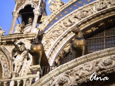 Os cavalos que actualmente figuram na balaustrada acima da entrada na basílica de S. Marcos são cópias dos originais que os venezianos trouxeram como troféu de guerra de Constantinopla em 1204, e que terão origem grega (séc. IV ou III a.C.) ou latina (séc. IV d.C.). Quando Napoleão conquistou a cidade também os levou para Paris como troféu de guerra mas, com melhor sorte que Constantinopla, estes foram devolvidos a Veneza.